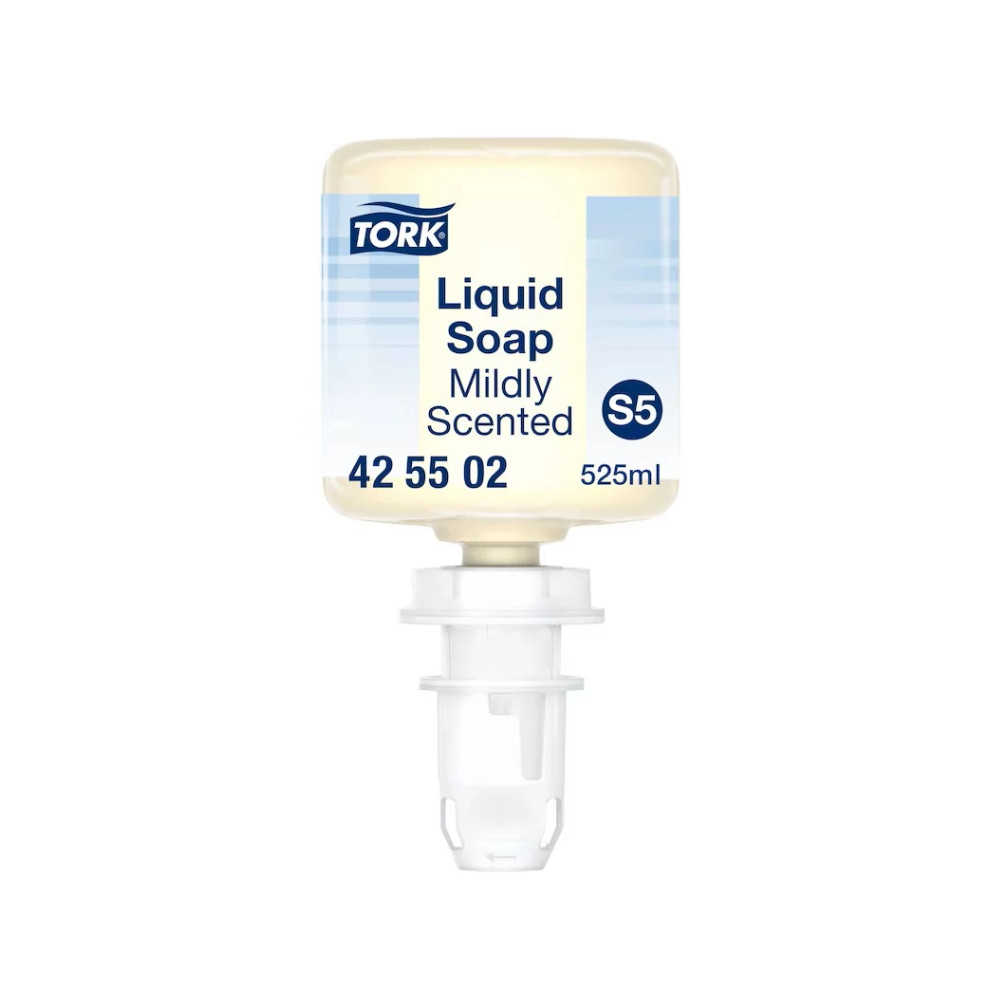 Tork folyékony szappan S5 illatosított 525 ml – enyhén illatosított folyékony kézmosó szappan utántöltő, amely Tork “Mini” S5 rendszerű szappan- és kézfertőtlenítő-adagolókhoz. A Tork 425502 cikkszámú folyékony szappan egy friss, enyhén illatosított kézmosó – ideális mindennapos kézhigiéniához irodákban, vendéglátóhelyeken, mosdókban és egyéb helyeken, ahol higiénikus kézmosásra van szükség. Főbb jellemzők Friss illat és kíméletes tisztítás: kellemes illatú, enyhén illatosított kézmosó folyadék, amely gyengéden tisztítja a kezet anélkül, hogy kiszárítaná a bőrt. Hidratáló összetevők: tartalmaz lipid-pótló, hidratáló anyagokat, amelyek segítik a bőr nedvességének megőrzését. Bőrbarát pH és dermatológiailag tesztelt: a formulát bőrbarát pH-val és dermatológiai teszttel ellenőrizték a mindennapi használat során. 96 % természetes eredetű összetevők: a termék összetevőinek nagy része (ISO 16128 szerint) természetes eredetű. Hatékony hideg vízzel is: alacsony hőmérsékleten, hideg vízzel is hatékony tisztítást biztosít, ami energiát takarít meg. Gyors és higiénikus utántöltés: a gyárilag zárt flakon minden utántöltésnél új pumpát kap, így csökkenti a kereszt-szennyeződés esélyét, és kevesebb mint 10 másodperc alatt cserélhető. Hulladékcsökkentés: az összenyomható palack akár 70 %-kal kevesebb hulladék-térfogatot eredményez használat után (Essity teszt alapján). Kompatibilitás: kizárólag Tork Mini (S5) adagoló rendszerekhez alkalmas.